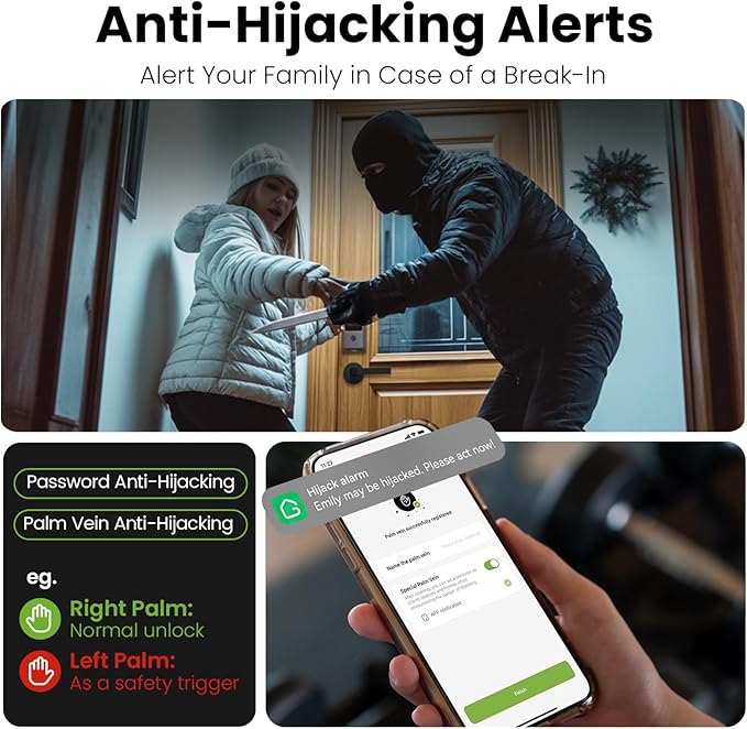 - Secure and Reliable Protection - Based on each person's palm vein pattern is unique and cannot be easily replicated or forged, the smart lock for front door ensures a strong safeguard for home. Moreover, your palm ID data is securely stored solely on your personal device, ensuring heightened security and privacy. In case of an attempted forced entry or hijacking situation, the Anti-Hijacking alarm provides a third layer of protection for your digital door lock.