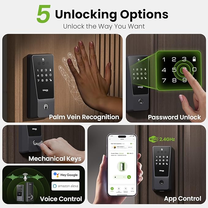 - 5 in 1 Smart Lock & Multiple Options - KD10 Ghome Smart lock offers 5 unlocking methods such as palm vein recognition, APP control, voice control (work with Alexa), password and keys, providing flexibility and convenience for different scenarios and personal preferences.
