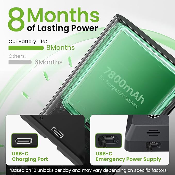 - Long-Lasting 8 Months Battery Life - The palm vein smart lock is equipped with a 7800mAh rechargeable battery, designed to last approximately 8 months with an average of 10 unlocks per day. It charges fully in just 4-6 hours. Additionally, it comes with a USB-C port for emergency power, ensuring you always have access to your home.