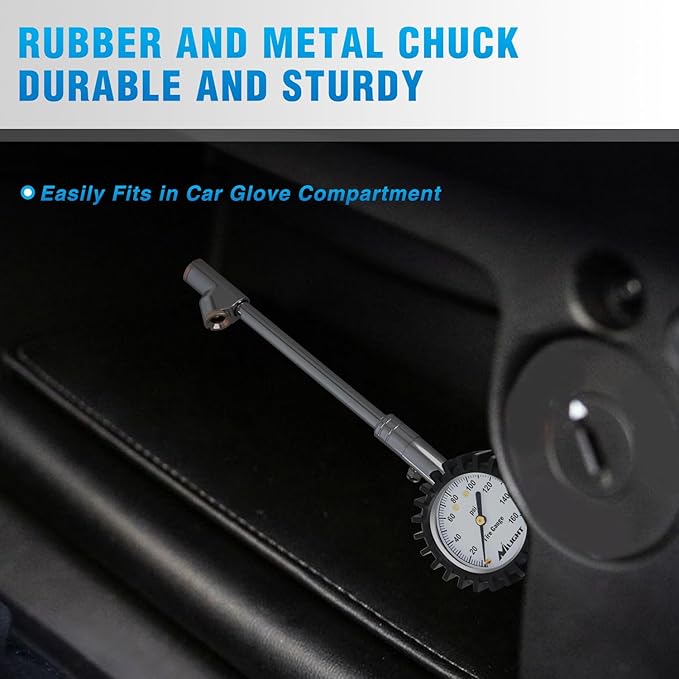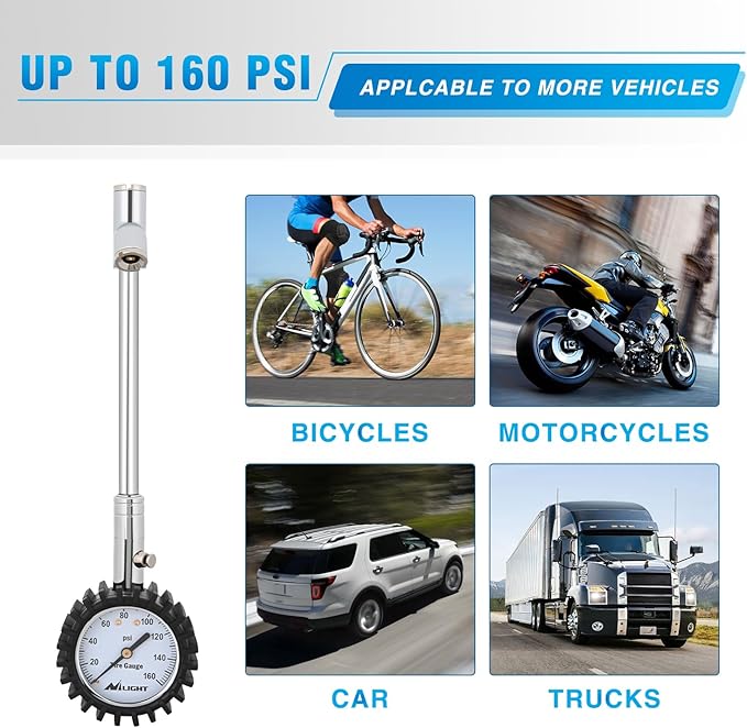 - Wide Range of Applications: 160 PSI range of the tire pressure gauge can measure vehicles with various scharder valve nozzles, and the readings are accurate and easy to read; suitable for cars, motorcycles, bicycles, trucks, SUVs, RVs, ATVs, vans, etc