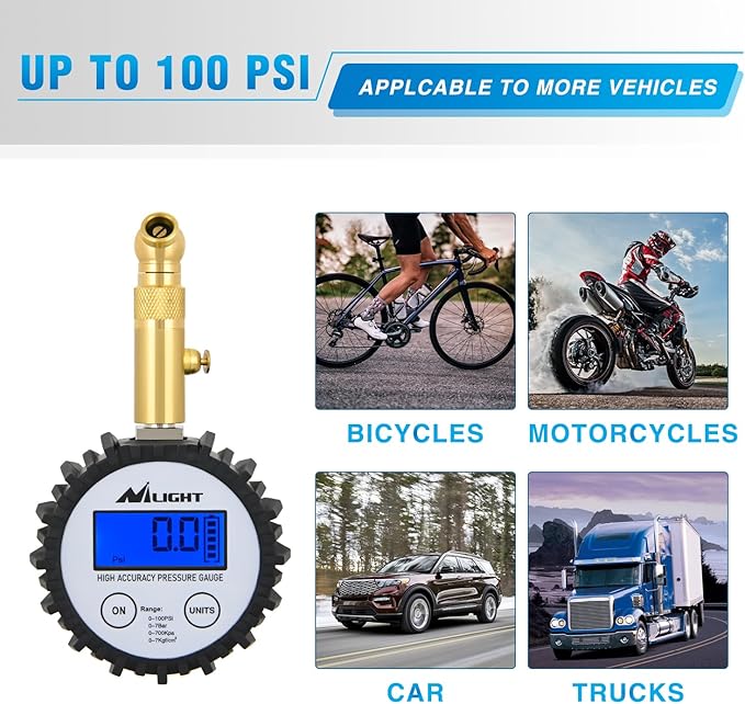 - Wide Range of Applications: 100 PSI range of the tire pressure gauge can measure vehicles with various scharder valve nozzles, and the readings are accurate and easy to read; suitable for cars, motorcycles, bicycles, trucks, SUVs, RVs, ATVs, vans, etc