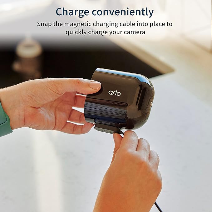 - In the box - Arlo Pro 5S 2K Spotlight Security Camera comes with 1 rechargeable battery, 1 solar panel, 1 magnetic charging cable, 1 short wall mount, 1 wall mount screw kit, quick start guide.