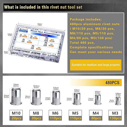 - 【Rivet Nut Sizes】: In This Rivet Nut Classification Tool Kit, We Provide 6 Kinds Of Metric Thread Sizes Of Rivet Nuts, Including: M3/130 Pcs, M4/80 Pcs, M5/110Pcs, M6/110Pcs, M8/30Pcs, M10/20Pcs, A Total Of 480Pcs Of Pressure Rivet Nuts Can Meet Your Various Needs.
