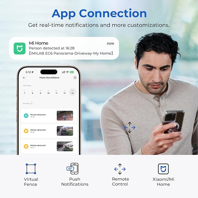 - App Connection: View live footage or playback footage from your phone. Set up a custom virtual fence to monitor important areas or reduce false alarms. Receive instant notifications whenever an object is detected from your home security camera