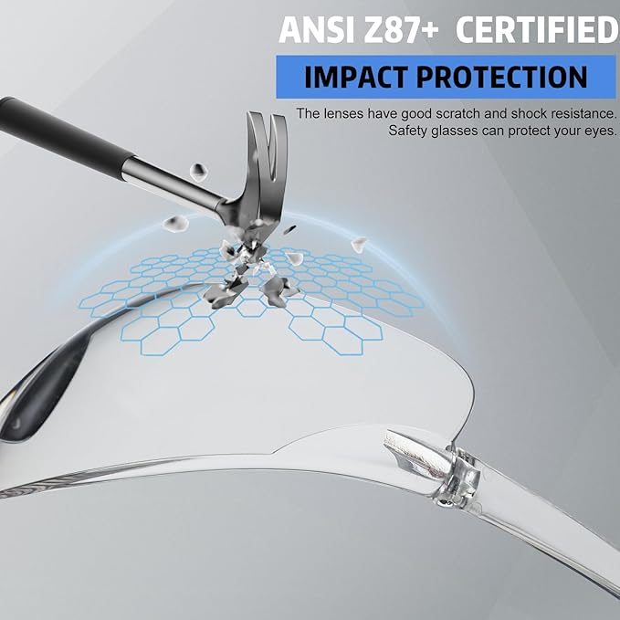 - ANSI Z87.1 STANDARD: Our glasses meets ANSI Z87+ and are tested by qualified apparatus to scientifically verify their safety. Meets the High Impact Requirements of ANSI Z87.1. Our safety protective glasses offer all-around eye protection from flying debris and particles