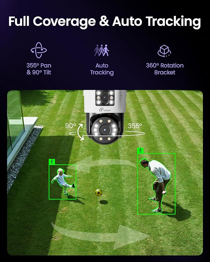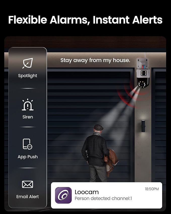 - 4K (4MP+4MP) Dual-Lens & Color Night Vision: Experience the vivid clarity of Loocam's 8MP camera kit. Equipped two professional-grade lenses(one fixed bullet lens, one P/T lens), only one camera can monitor two areas at the same time. The all-new color night vision plus 3 smart night modes let you monitor with daylight-like clarity even in dim or dark conditions.