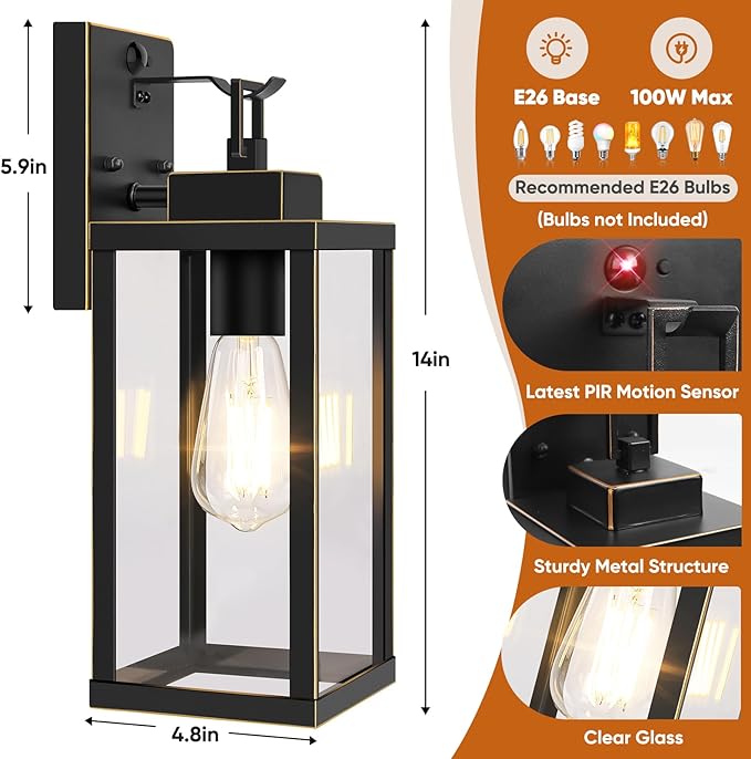 - Easy Installation & E26 Socket: Our motion sensor outdoor wall light arrives pre-assembled with all mounting accessories for easy installation. The open-bottom design allows for quick bulb replacement and cleaning. It works well with various E26 base bulbs(100W Max). Dimmable LED bulbs or incandescent bulbs are recommended for better performance
