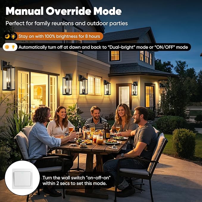 - 3 Lighting Modes: This porch light offers 3 modes: Dual-bright, ON/OFF, and Manual Override. In Dual-bright mode, it stays at 40% brightness at night (adjustable from 15-50%), increasing to 100% when motion is detected. In ON/OFF mode, it remains off until motion is detected, then lights up at 100% brightness. Manual Override mode keeps the light at 100% brightness for 6-8 hours, with or without motion—ideal for outdoor parties