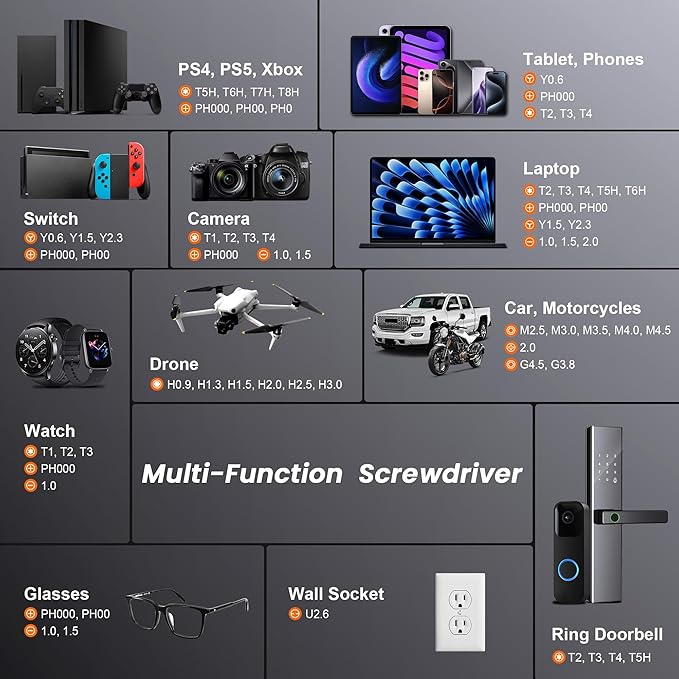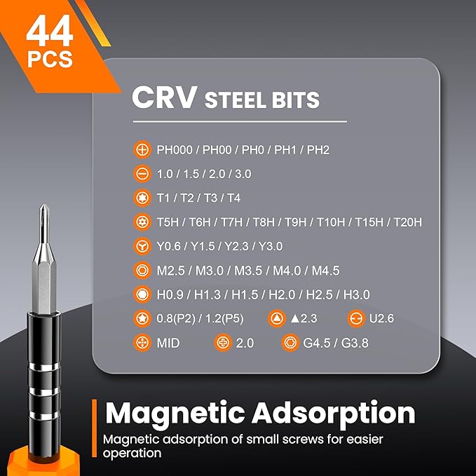 - 【59 in 1 Precision Screwdriver Set】The screwdriver set contains 44 screwdriver bits, Phillips PH000,PH00,PH0,PH1,PH2; Flathead -1.0, -1.5 -2.0,-3.0; Torx T1 T2 T3 T4 T5, Torx security TR6 TR7 TR8 TR9 TR10 TR15 TR20; Triwing Y0.6, Y1.5. Y2.3, Y3.0; Pentalobe P2(0.8) P5(1.2); Triangle 2.3; U-type U2.6; H-type: H0.9, H1.3, H1.5, H2.0, H2.5, H3.0; MID-type: MID; Sleeve: M2.5, M3.0, M3.5, M4.0, M4.5, Cross 2.0, G3.8, G4.5