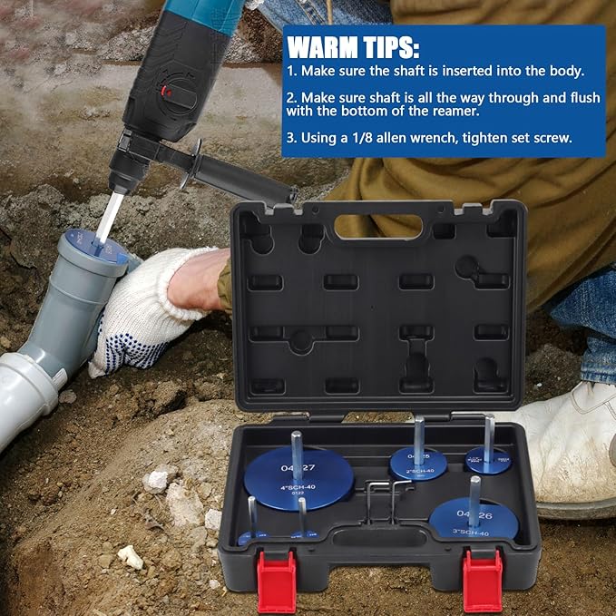 - 【6PCS PVC PIPE REAMER】XJX 6-piece plastic pipe fitting reamer kit includes: PPR75, PPR100, PPR150, PPR200, PPR300, PPR400, 2 allen wrench. Fits into standard 1/2 inch standard drills, cordless drills, or impact drills. Shaft Size: 3/8" hex.