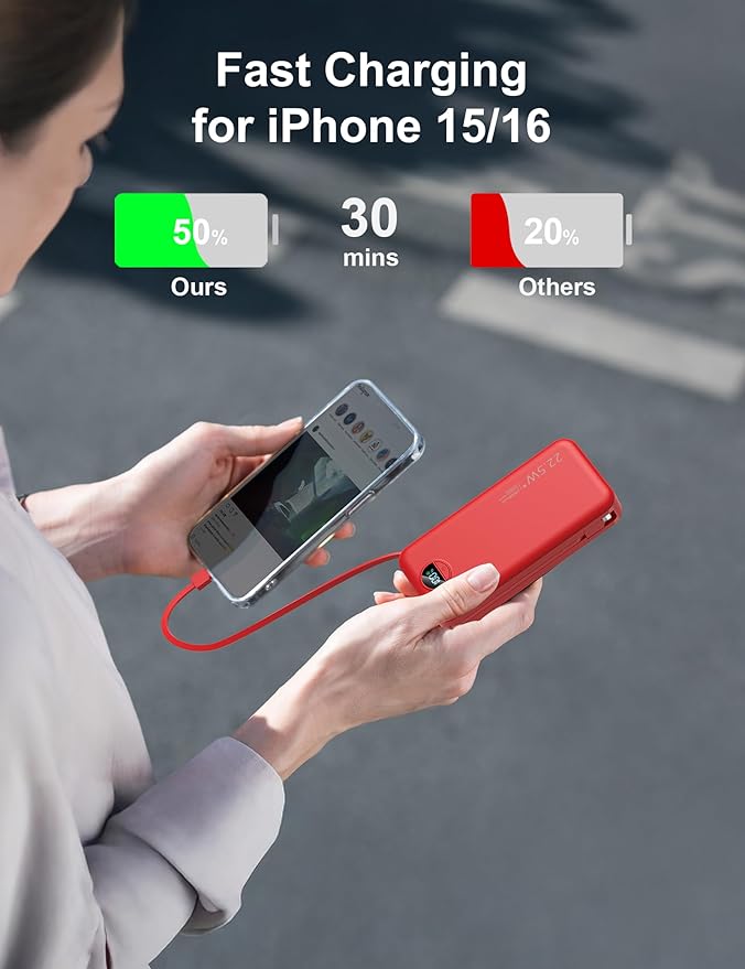 - 【Built in Cables and AC Wall Plug】This portable charger built-in cables and wall plug make it iPhone, Android, and USB C devices. no worry about carrying various cables or chargers.It's your best travel accessories for choosing.