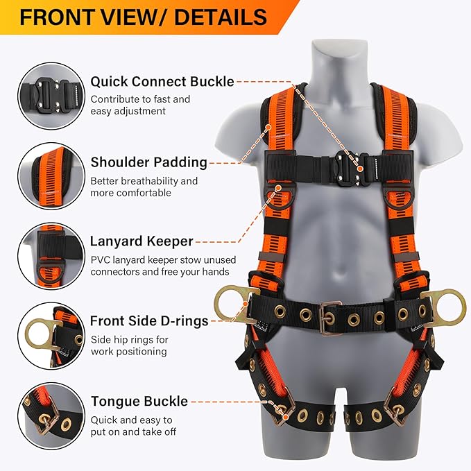 - 【UPDATED BUCKLE COMBINATION】Combination quick-connect buckle on chest strap with tongue buckles on leg strap 5 points of adjustability contribute to fast and easy adjustment.Quick and easy to put on and take off that can be quickly adjusted to fit the workers' body, even while wearing gloves. Properly wear and connected,fall protection safety harnesses kit reduces the risk of serious injury when distribute the force of a fall across the body.Min. Breaking Strength: 4000lbs/18KN.
