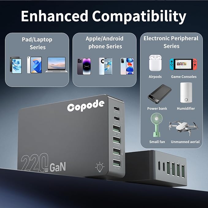 - WIDELY COMPATIBILITY - This Copode GaN charger supports a Max output power of 100W on the USB C1 ports, a max output power of 30W on the USB C 2 and USB C 3 ports and a maximum output power of 20W on the USB A1 and USB A2port. The usb c charger station also supports most fast charging protocols such as PD3.0, QC4.0, QC3.0, QC2.0, AFC, FCP, PPS, etc. compatible with MacBook Pro 16", 14", 13", MacBook Air, Dell XPS, compatible with iPhone 16,15 Pro/14 Pro Max/13/12, Samsung Galaxy S25 Plus/S24 Ultra/ S23 /S22, Moto G51/Razr 50 Ultra,OnePlus 13/Ace 3/5Pro,for iPad Pro, iPad Air Series AirPods Pro,for AppleWatch,Switch, Steam Deck and more