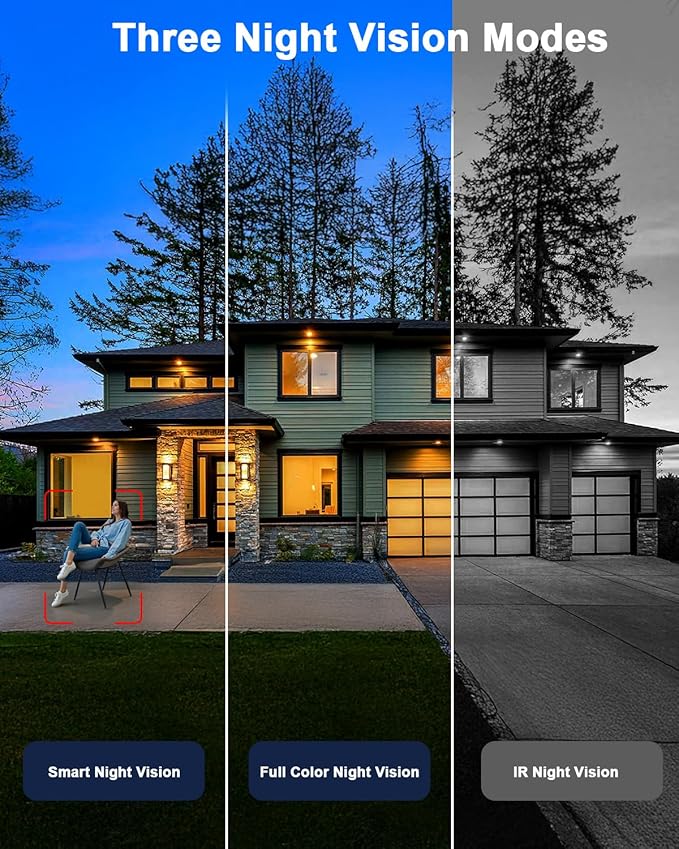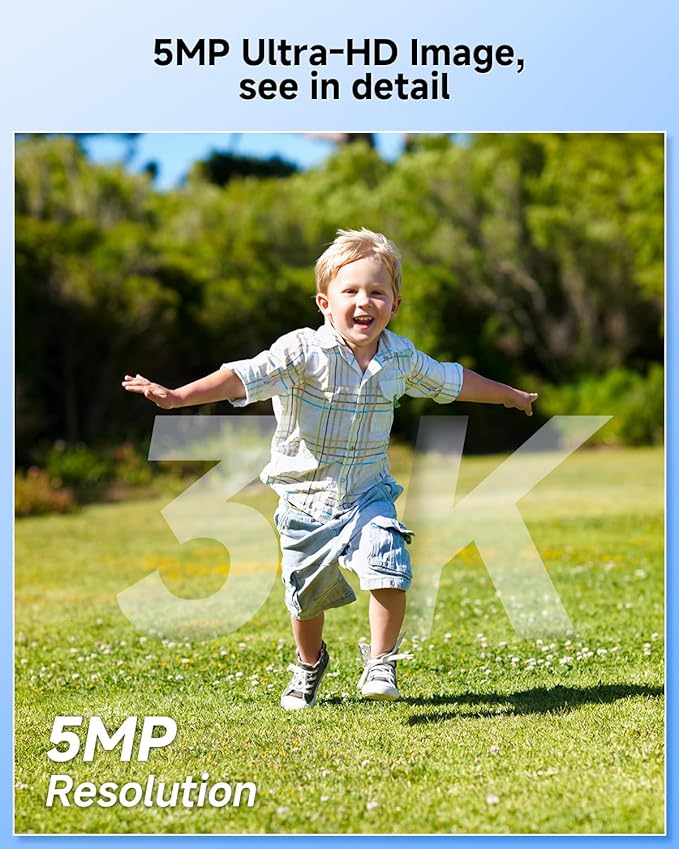 - Sharper Images: The 4 camera security system 3K/5MP resolution delivers images that are 40% sharper than 2K. Capture clear faces and license plates so you know exactly who is coming and going. The security cameras are equipped with a spotlight that provides clear color night vision for improved nighttime security and refinement
