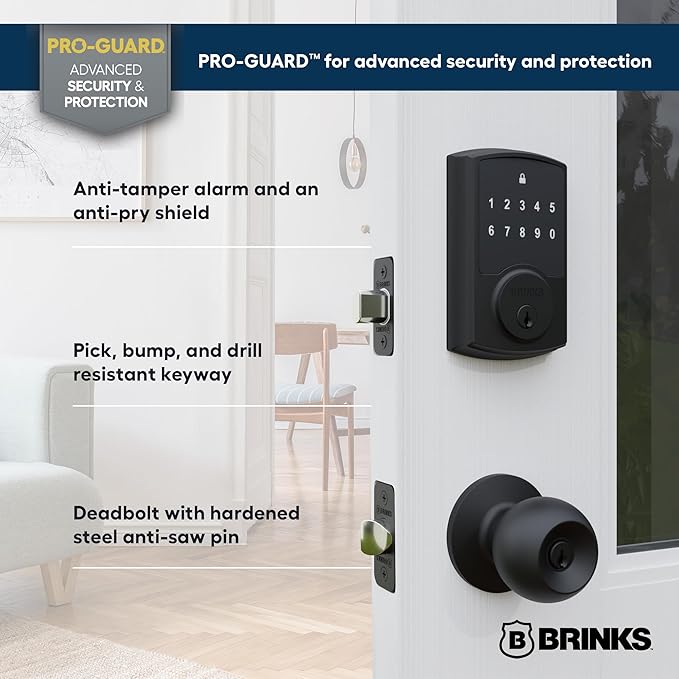 - Advanced Security with PRO-GUARD Technology: Anti-tamper alarm, anti-pry shield, pick-resistant keyway, and 1-inch deadbolt with a hardened steel anti-saw pin for maximum protection.