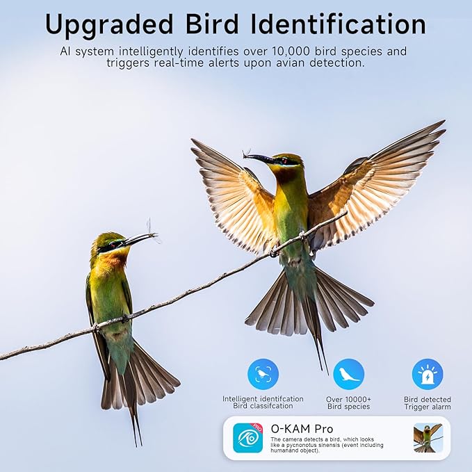- 【AI-Powered 2-in-1 Security & Bird Camera】Protect your home and explore nature effortlessly! Dual-purpose design offers 24/7 property monitoring (garage/night) and wildlife observation (hummingbirds/dawn). Advanced AI identifies 10,000+ bird species* while keeping your space secure. One camera, endless value—day to night. (Subscription required for bird database)
