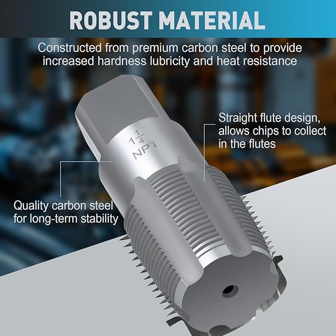 - 【METRIC TAP SET】: Made of carbon steel, this 1-1/4 inch NPT tap is designed for threading pipes, ensuring a tight seal and providing stable, reliable connections to meet various pipe thread processing needs.