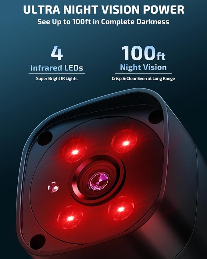 - 《Night Vision Up to 100ft》Never miss a moment—even in total darkness. Equipped with 4 high-powered infrared LEDs, our wireless wifi camera outdoor delivers crystal-clear images up to 100ft away. It’s the perfect choice for 24/7 surveillance dvr kits, home security system wireless setups, or wireless cameras for business.