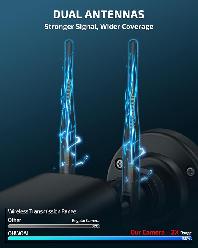 - 《Stronger Signal, Wider Coverage》Boost your security with our wireless security camera system featuring dual antennas for 2x stronger signal penetration. Whether you're monitoring your front porch or backyard, this wireless outdoor camera system ensures a smooth, uninterrupted feed over longer distances—ideal for any home or small business setup. Say goodbye to lag with this wireless security camera solution.