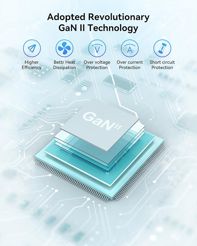 - 【Powered by GaN+ Technology】:GaN+ technology enhances charger performance, achieving superior power density and efficiency compared to traditional silicon-based models. Yields compact, lightweight designs with minimized energy loss, optimized energy utilization, and decreased heat generation