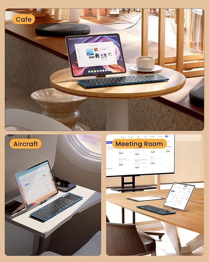 - Foldable Keyboard with Trackpad: This portable keyboard has a multi-touch trackpad that adapts to Win or IOS system, with various trackpad gestures, providing a comfortable usage experience while clicking, scrolling, and more. Very convenient for your typing, watching, working, and carrying without a mouse needed(Note: 1.for iPad users, please turn on the "AssistiveTouch" first. 2.Due to reasons related to the application itself, some gestures function may not be available)