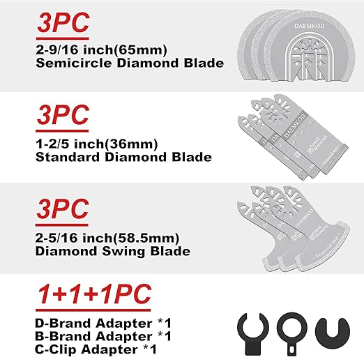 - 【3 Adapters and universal interface】 DAEMKOD 9pcs diamond saw blades is suitable for 95% of oscillating tools on the market, and also includes 3 pcs oscillating tool accessories.