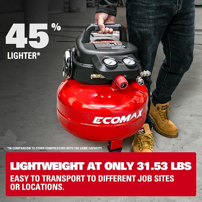 - 【Portability】 The ECOMAX Air Compressor features a 6-gallon capacity, which optimizes both portability and air storage. This air compressor weighs only 31.53 pounds. Its lightweight and compact design contribute to easy mobility. This compressor is perfect for powering air tools, brad nailers, and inflating car tires.