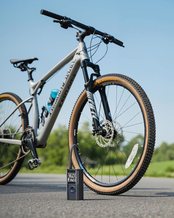 - CORDLESS, PORTABLE TIRE PUMP: Powools cordless bike tire pump features built-in rechargeable batteries, enabling tire inflation anytime, anywhere, without needing an external power supply. Its compact size makes it highly portable. The pump also includes a handy storage bag for easy placement in your car, bike rack, or backpack, making it an ideal companion for both travel and home use.