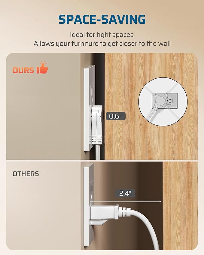 - [Compact & Low-Profile] This 1 foot extension cord with a flat plug sits flush against the wall, preventing obstruction while maintaining accessibility in tight spaces. Its short-length design effortlessly tucks behind sofas, nightstands, cabinets, and vanities, keeping your setup neat