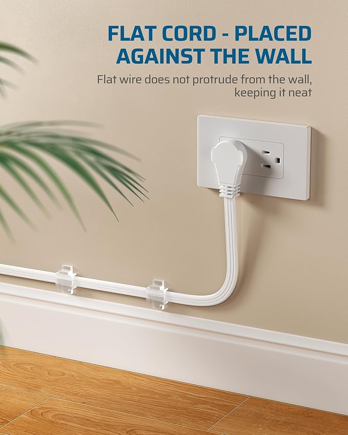 - [Space-Saving Flat Plug] Engineered with an ultra-slim profile, this flat extension cord's plug sits completely flush against walls, making it ideal for concealed placement behind furniture like sofas, nightstands, or cabinets; no more bulky plugs sticking out in tight spaces