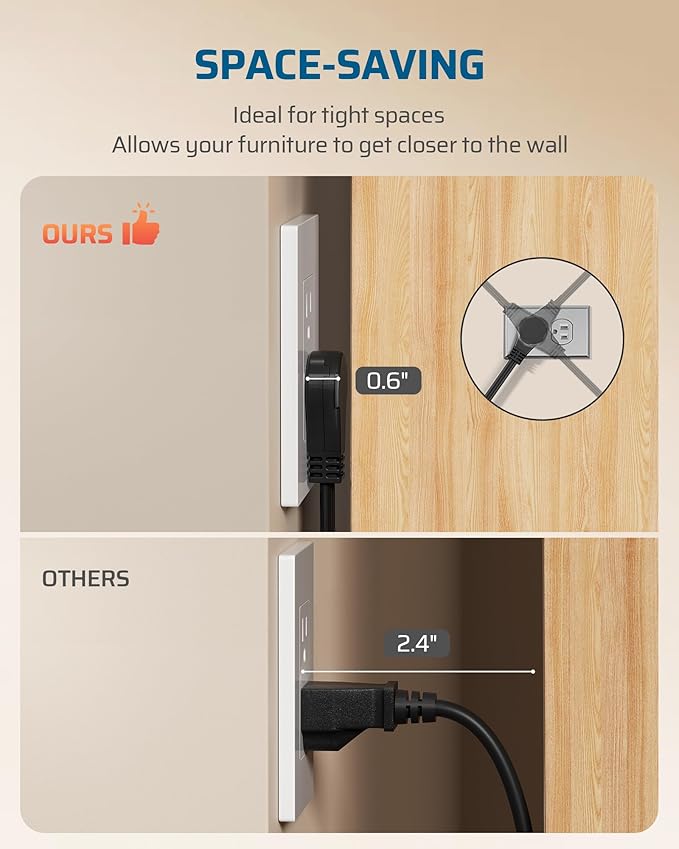 - [Space-Saving Flat Plug] Engineered with an ultra-slim profile, the flat plug sits completely flush against walls, making it ideal for concealed placement behind furniture like sofas, nightstands, or cabinets; no more bulky plugs sticking out in tight spaces