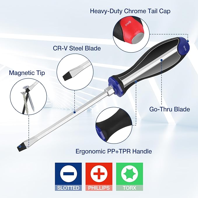 - Comfortable Ergonomic Grip: The screwdriver features a large, ergonomic PP+TPR handle for a soft, non-slip grip, providing better control and reduced hand fatigue; The chrome-plated steel end cap withstands hammer strikes for heavy-duty tasks
