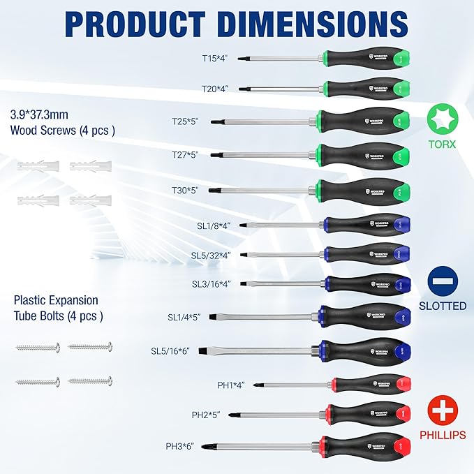 - 22-Piece Screwdriver Set: Includes 3 Phillips, 5 Slotted and 5 Torx professional screwdrivers, along with 4 wood screws and 4 plastic expansion bolts for rack assembly; Also comes with a magnetizer/demagnetizer tool, covering a wide range of needs for home improvement, automotive repair, and heavy-duty industrial tasks