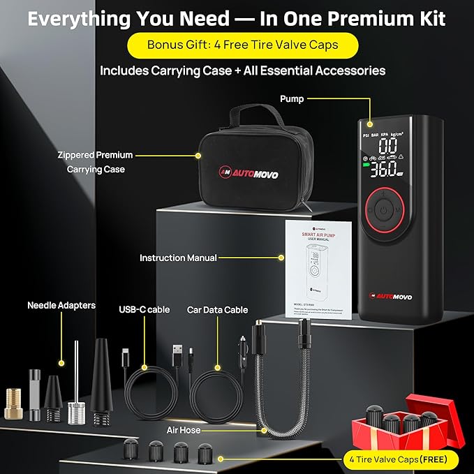 - Air pump comes with tire inflator*1, connecting air hose*1, atmospheric nozzle*1, stingy mouthpiece*1, French adapter*1, ball needle*1, fuse wire*1, DC power cord*1, USB charging cable*1, user manual*1, valve stem caps*4 and storage bag*1. If you have any questions or concerns, please contact us!