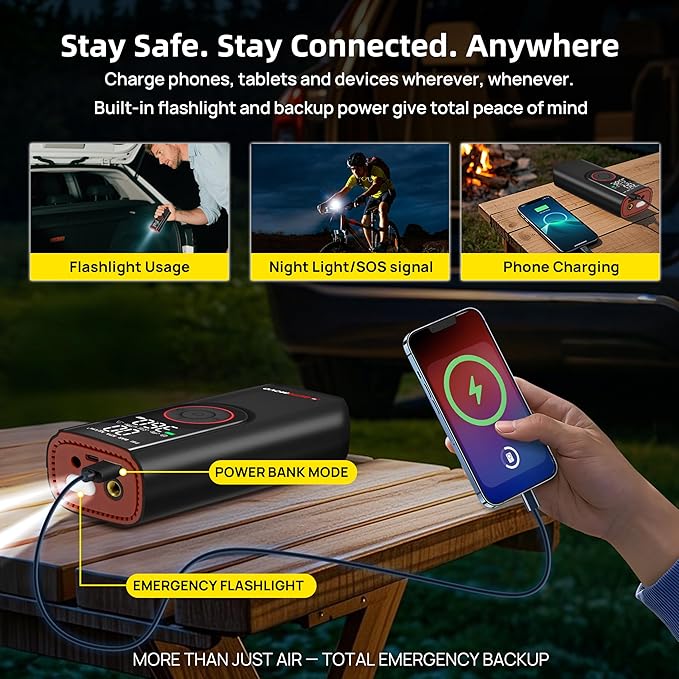 - Air compressor portable with multiple practical functions like C-type charging port, and 5V/2A USB output port that serves as an emergency power source for mobile phones or other electronic devices. LED flashlight for inflating in the dark, changing tires, or signaling other vehicles at night