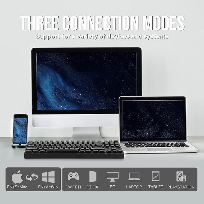 - Wire-free Convenience: For users of all devices and OS systems, the EPOMAKER P87 is compatible in cable, wireless 2.4Ghz or Bluetooth 5.0 with Mac, Linux and Mainstream Gaming controllers. Relish in the hassle-free USB-C cable mode for ultra-fast low latency, or the cluster-free wireless mode in stable 2.4Ghz and versatile Bluetooth mode. Switch between Mac/Win mode with FN+A/S for cross-system multicasting, and stream through the digital world with the tri-mode P87 keyboard as your ideal companion