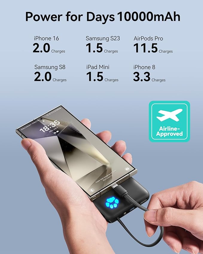 - Grab & Go, No Extra Wires Needed: This 10000mAh power bank features a built-in USB-C cable that charges both your phone and the power bank and doubles as a lanyard. Leave home without extra cables.