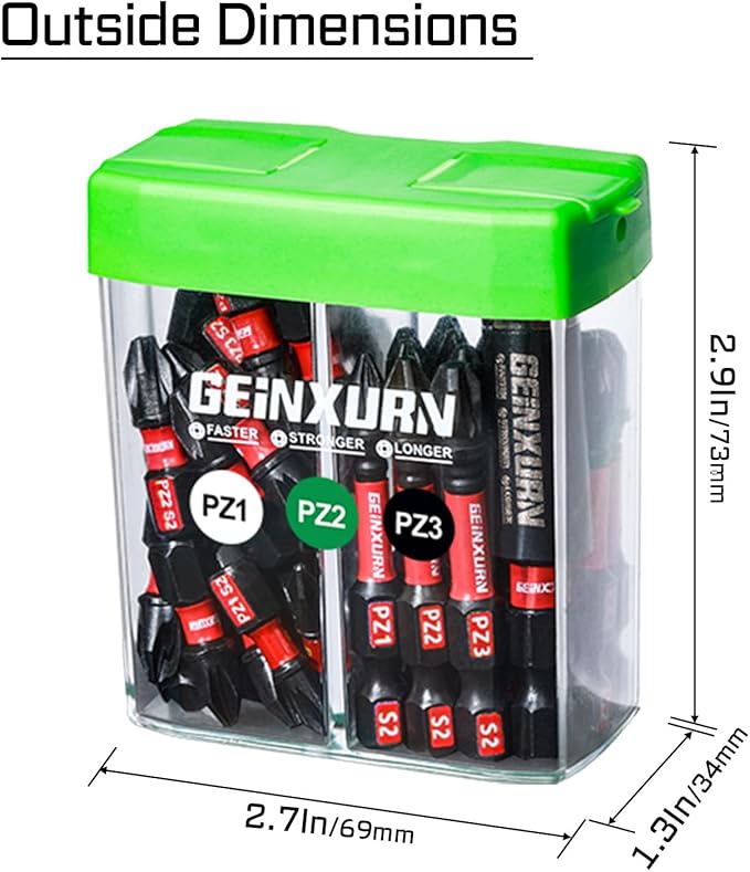 - Pozi Screwdriver Bit Set: 30pcs-1inch(PZ1X7,PZ2X16,PZ3X7),12pcs-2inches(PZ1X2,PZ2X8,PZ3X2) driver bits and 1pcs 2.36(60mm) impact bit holder , they're all have a customized box.