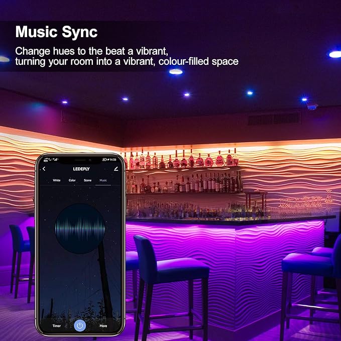 - 【Music Sync】With the latest music sync technology, these smart bulbs can change hues to the beat of your music, turning your room into a vibrant, color-filled space. Simply open up the app, pick out the bulb or group of bulbs you’re after, and click on the “Music” option on the control panel to sync your lighting with your or others’ music by playing the tunes from your favorite streaming service