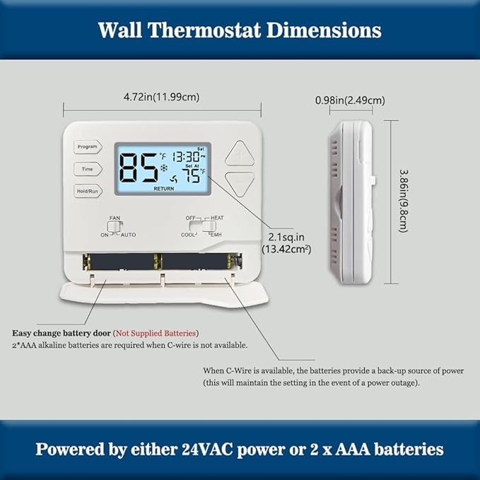 - Dual Power Supply: Can be powered by 24VAC power or 2 AAA batteries, No common wire (C-wire) required on most systems (only required on heat only and cool only systems).