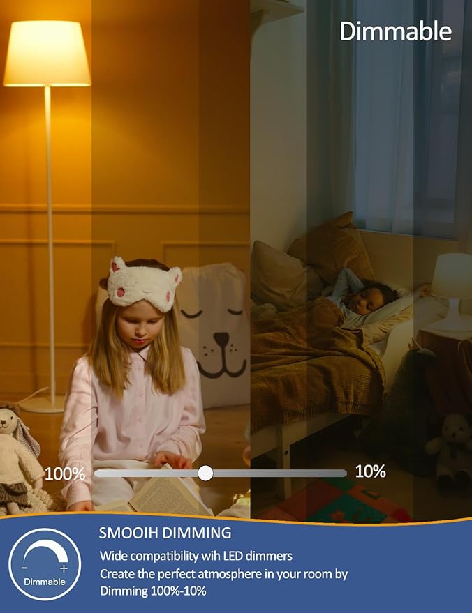 - ๐กใDimmableใ: Effortlessly adjust brightness levels with our dimmable LED light bulbs, compatible with most LED dimmers. no flicker, no glare. Whether you need warm light for sleep or a soft glow for ambiance, these LED bulbs allow smooth transitions from 100% to 0% brightness to perfectly match your mood or dรฉcor.