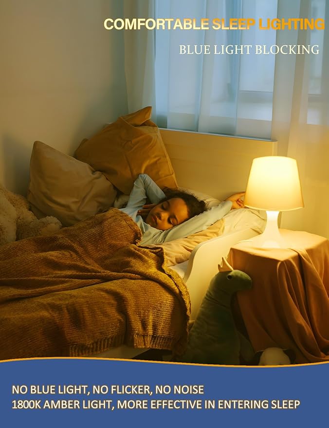 - ๐กใEnhance Sleep Qualityใ: Blue-light free, 1800K warm light, our sleep aid amber light bulbs will make you and your family feel warm and inviting. Soothing your mood and help you to be more relaxed and sleep peacefully at night. Amber light provides enough light to be clearly visible and not too bright to interfere with sleep patterns.