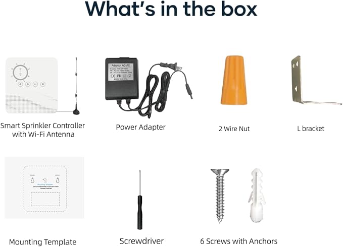 - What You Get: 1 Smart Sprinkler Controller, 1 Power Adapter,6 Screws with Anchors, 1 Mounting Template. User manual and friendly customer service.