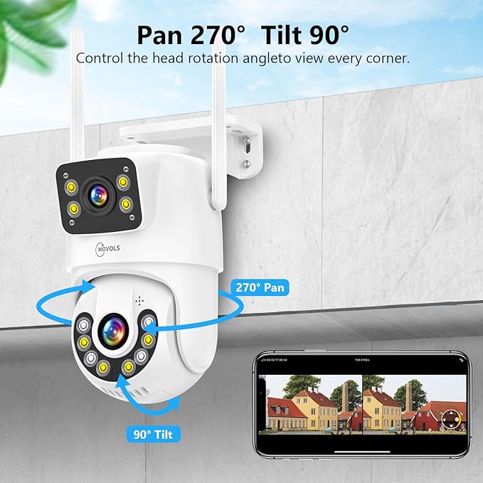 - 【Pan Tilt 360° View & 8MP HD Image】WIFI security camera wireless outdoor is designed with 270° horizontal rotation,Vertical 90°, providing wide-area 360°view almost no blind spots,4MP+4MP high resolution let you see more detail. PTZ APP remote cameras cámara 360 para casa can watch up to 30 feet range of clear pictures and videos.It's a great choice to protect the safety of your property and family. (The camera is corded electric camera, and not a battery camera).
