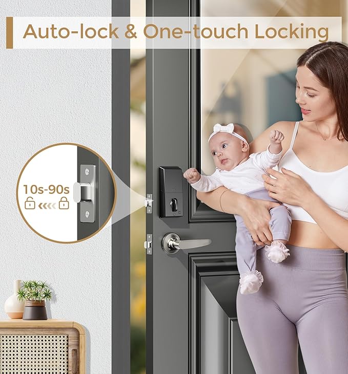 - Auto Lock and One Touch Lock: The door lock adopts an intelligent one-touch switch design and supports enabling the automatic locking function. This function can set the automatic locking time from 10 seconds to 30 minutes. This design provides great convenience for users.