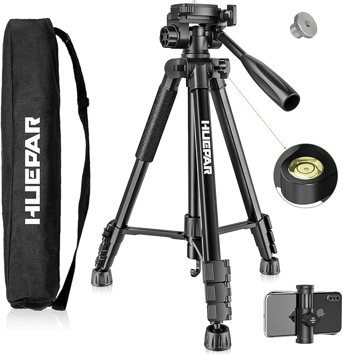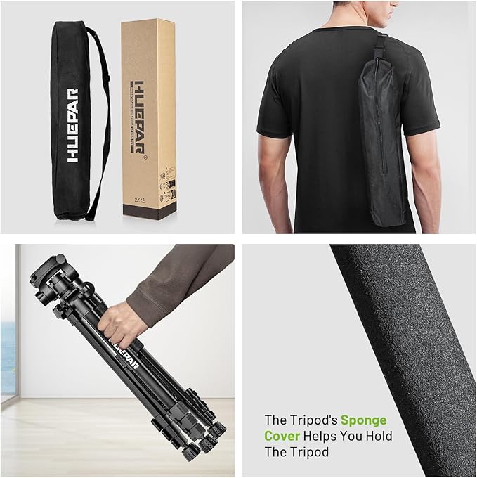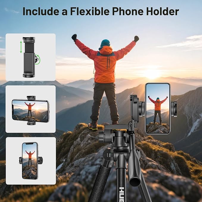 - Adjustable 4-Section Legs & Center Column: Featuring 4 adjustable legs with height-locking buckles and an extendable center column, this tripod meets various height requirements. With a height range of 18.72" to 57" and a 22lb (10kg) load capacity, it’s lightweight (1.11kg) but sturdy, making it easy to carry in the included storage bag for on-the-go use