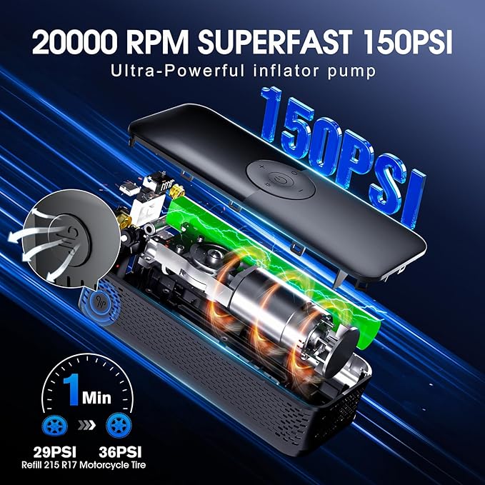 - 【3X Faster Inflation】 The portable tire inflator for car is 3X faster than other cordless tire inflator! Driven by a 20000 RPM motor, our rapid portable air compressor for car tires inflates a standard car tire (185/65/R15) from 27PSI to 36PSI in under 1 minute. Lightweight,1.2 lbs. Max 150PSI pressure and 35L/Min airflow car tire air pump portable for trucks, motorcycles, bikes, and even inflatable kayaks