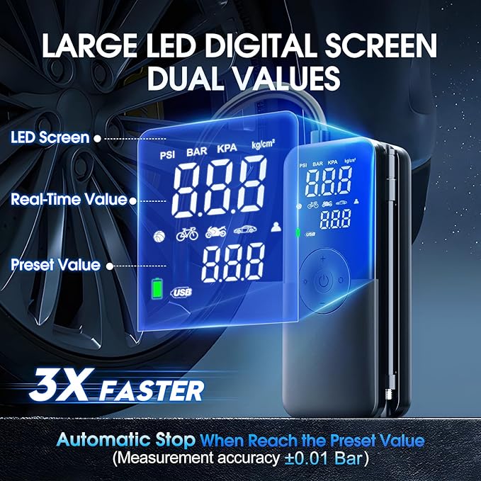 - 【0.1 BAR Digital Gauge & Auto Shut-Off】 The digital cordless tire inflator’s LCD screen shows real-time and target pressure. Set your PSI for winter roads, summer highways or off-road adventures. Auto shut-off at your exact preset pressure, No more overinflation! Perfect car tire air pump portable for snowy roads or off-road trips