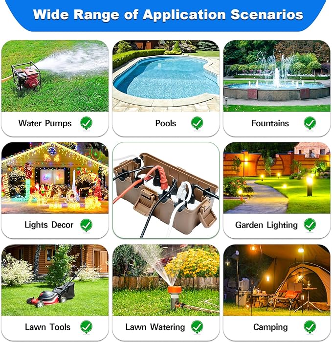 - WIDE APPLICATIONS:Ideal for a variety of outdoor & indoor applications including patio, lawn and garden power tools,holiday lighting, landscape decorations, pool pumps, fountains, fish ponds, patio heaters, hot tub, air conditioners, security cameras and more.