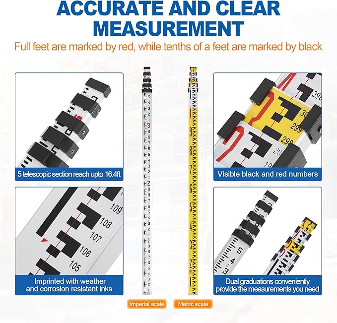 - WITH TRIPOD AND ROD: Survey tripod with extendable legs and quick lock system, the fully extended height can reach 65inch (1.65m); Aluminum grade rod, five telescopic sections reach up to 16.4ft (5m) in length. Graduations on both sides, one side marking in feets/tenths (min.: 0.01ft), the other side in decimeters/centimeters (min.: 0.5cm).